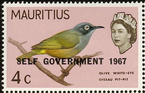 Visibility: public Image owner: none postage 9/1/1967 4c issue=1967b dt=birds (1965 Mauritius) d=Olive White-eye (1965) ovpt=SELF GOVERNMENT 1967 oc=blk on=3/16/1965-4c wmk=mult crown & script CA perf=14 Crops No visible images cropped from this one. Measurements Resolution is unknown. Source Source name: Colnect File URL: http://i.colnect.net/b/734/494/Mauritius-Olive-White-eye-Zosterops-chloronothos.jpg Uploaded August 24, 2014, 6:18 pm by Stan Shebs |