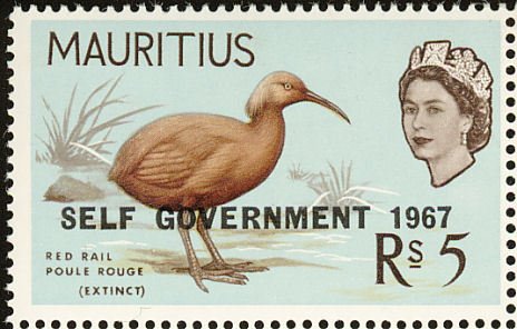 Visibility: public Image owner: none postage 9/1/1967 5r issue=1967b dt=birds (1965 Mauritius) d=Mauritius Red Rail ovpt=SELF GOVERNMENT 1967 oc=blk on=3/16/1965-5r wmk=mult crown & script CA perf=14 Crops No visible images cropped from this one. Measurements Resolution is unknown. Source Source name: Colnect File URL: http://i.colnect.net/b/734/505/Mauritius-Red-Rail-Aphanapteryx-bonasia.jpg Uploaded August 24, 2014, 6:18 pm by Stan Shebs |