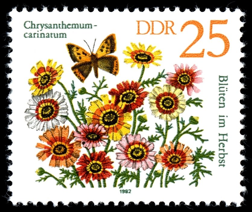 Visibility: public Image owner: none postage 9/21/1982 25pf multi dt=fall flowers d=Chrysanthemum carinatum unwmk Crops No visible images cropped from this one. Measurements Resolution is unknown. Source Source name: Colnect File URL: http://i.colnect.net/images/b/1981/924/Painted-Daisy-Chrysanthemum-carinatum.jpg Uploaded June 10, 2016, 6:40 pm by Stan Shebs |