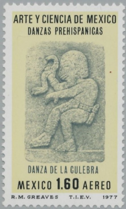 Visibility: public Image owner: none airmail 12/26/1977 1.60p multi dt=Pre-colonial Statuettes wmk=MEX & eagle Crops No visible images cropped from this one. Measurements Resolution is unknown. Source Source name: Colnect File URL: http://i.colnect.net/images/b/2662/947/Dance-of-the-Snake.jpg Uploaded July 1, 2016, 8:37 pm by Stan Shebs |
