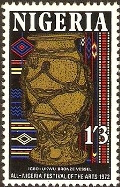 Visibility: public Image owner: none postage 9/1/1972 1sh3p multi issue=All-Nigeria Festival of the Arts wmk=mult crown & script CA Crops No visible images cropped from this one. Measurements Resolution is unknown. Source Source name: Colnect File URL: http://i.colnect.net/b/2833/033/Roped-bronze-vessel-Igbo-Ukwu.jpg Uploaded July 11, 2016, 1:51 pm by Stan Shebs |