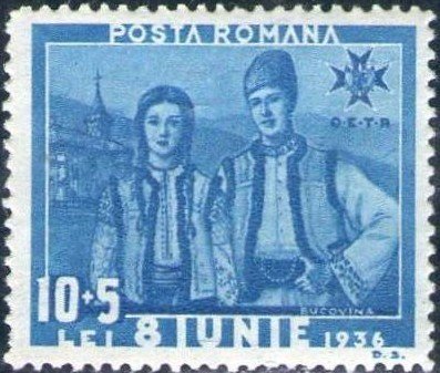 Visibility: public Image owner: none semipostal 6/8/1936 10+5L ltbl issue=King Carol II accession 6th dt=national costumes (1936) d=youth of Bucorina wmk=crowns & monograms perf=13.5 Crops No visible images cropped from this one. Measurements Resolution is unknown. Source Source name: Colnect File URL: http://i.colnect.net/b/1213/521/National-Costumes---Bucovina.jpg Uploaded August 24, 2014, 8:36 pm by Stan Shebs |