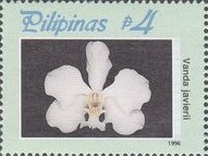 Visibility: public Image owner: none postage 9/20/1996 4p multi issue=ASEANPEX '96 b dt=orchids (1996 Philippines) d=Vanda javierii unwmk perf=14 Crops No visible images cropped from this one. Measurements Resolution is unknown. Source Source name: Colnect File URL: http://i.colnect.net/b/3002/628/Vanda-javierii.jpg Uploaded July 13, 2016, 9:22 pm by Stan Shebs |
