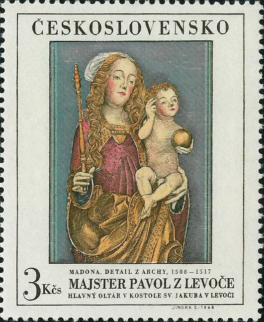 Visibility: public Image owner: none postage 11/29/1968 3k multi dt=paintings (1968 Czechoslovakia) d=Majster Pavol z Levoče Madona detail z archy 1508-1517 unwmk perf=11.75 Crops No visible images cropped from this one. Measurements Resolution is unknown. Source Source name: Colnect File URL: http://i.colnect.net/b/438/462/Madonna-and-Child-by-Master-Paul-of-Levoca-1518.jpg Uploaded August 24, 2014, 8:58 pm by Stan Shebs |