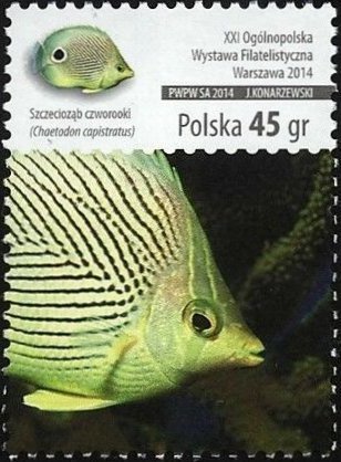 Visibility: public Image owner: none postage 10/10/2014 45gr multi issue=XXI National Philatelic Exhibition d=Chaetodon capistratus (2014 Poland) unwmk perf=11.5x11 Crops No visible images cropped from this one. Measurements Resolution is unknown. Source Source name: Colnect File URL: http://i.colnect.net/images/b/3128/245/Foureye-Butterflyfish-Chaetodon-capistratus.jpg Uploaded July 16, 2016, 5:49 am by Stan Shebs |