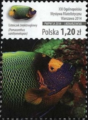 Visibility: public Image owner: none postage 10/10/2014 1.20z multi issue=XXI National Philatelic Exhibition d=Pomacanthus xanthometopon (2014) unwmk perf=11.5x11 Crops No visible images cropped from this one. Measurements Resolution is unknown. Source Source name: Colnect File URL: http://i.colnect.net/images/b/3128/249/Yellowface-Angelfish-Pomacanthus-xanthometopon.jpg Uploaded July 16, 2016, 5:49 am by Stan Shebs |