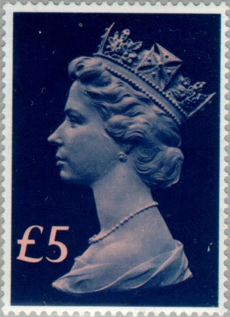 Visibility: public Image owner: none postage 2/2/1977 5£ dkbl&pink issue=1976 Machin d=Queen Elizabeth II (Machin) unwmk perf=14x15 Crops No visible images cropped from this one. Measurements Resolution is unknown. Source Source name: Colnect File URL: http://i.colnect.net/b/122/049/Queen-Elizabeth-II---Large-Machin.jpg Uploaded November 22, 2012, 2:04 pm by Stan Shebs |