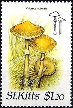 Visibility: public Image owner: none postage 8/26/1987 $1.20 multi dt=Fungi (1987 St. Kitts) d=Psilocybe cubensis (1987) wmk=crown & script CA spiral perf=14 Crops No visible images cropped from this one. Measurements Resolution is unknown. Source Source name: Colnect File URL: http://i.colnect.net/b/2920/593/Psilocybe-cubensis.jpg Uploaded July 26, 2016, 2:29 pm by Stan Shebs |