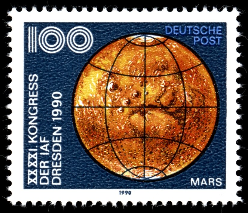 Visibility: public Image owner: none postage 10/2/1990 100pf multi issue=Astronautics Federation Congress 1990 d=Mars (1990 German Democratic Republic) unwmk Crops No visible images cropped from this one. Measurements Resolution is unknown. Source Source name: Colnect File URL: http://i.colnect.net/b/357/659/Mars.jpg Uploaded August 24, 2014, 10:04 pm by Stan Shebs |