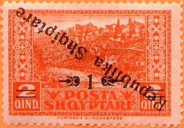 Visibility: public Image owner: none postage 5/20/1925 1q org issue=1925b dt=towns (1923) d=Gjinokaster ovpt=Republika Shqiptare oc=blk on=1924-1q unwmk Crops No visible images cropped from this one. Measurements Resolution is unknown. Source Source name: Colnect File URL: http://i.colnect.net/b/3901/597/Albanian-Repulic-inverted-overprint.jpg Uploaded April 6, 2017, 9:47 pm by Stan Shebs |