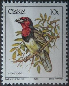 Visibility: public Image owner: none postage 12/4/1981 10c issue=birds unwmk Crops No visible images cropped from this one. Measurements Resolution is unknown. Source Source name: Colnect (old) File URL: http://i.colnect.net/images/f/1265/921/Lybius-torquatus.jpg Uploaded November 25, 2012, 4:12 am by Stan Shebs |