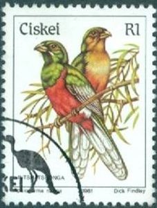 Visibility: public Image owner: none postage 12/4/1981 1r multi issue=birds d=Apaloderma narina (1981) unwmk Crops No visible images cropped from this one. Measurements Resolution is unknown. Source Source name: Colnect (old) File URL: http://i.colnect.net/images/f/1265/927/Apaloderma-narina.jpg Uploaded November 25, 2012, 4:12 am by Stan Shebs |