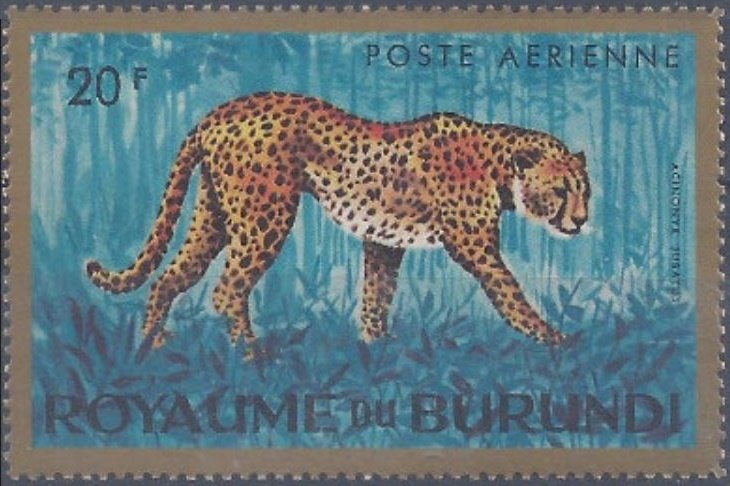 Visibility: public Image owner: none postage 2/10/1964 20fr dt=animals (1964 Burundi) d=cheetah (1964) unwmk Crops No visible images cropped from this one. Measurements Resolution is unknown. Source Source name: Colnect File URL: http://i.colnect.net/b/2792/857/Cheetah-Acinonyx-jubatus.jpg Uploaded April 13, 2017, 2:36 am by Stan Shebs |