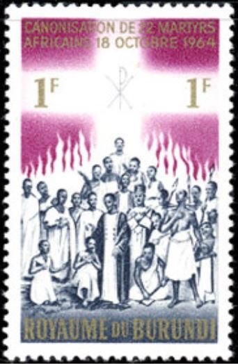 Visibility: public Image owner: none postage 11/12/1964 1fr issue=African martyr canonization unwmk Crops No visible images cropped from this one. Measurements Resolution is unknown. Source Source name: Colnect File URL: http://i.colnect.net/b/2792/765/Group-of-Martyrs.jpg Uploaded April 13, 2017, 2:36 am by Stan Shebs |