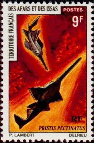 Visibility: public Image owner: none postage 7/1/1971 9fr multi issue=Marine Fauna dt=Marine Fauna (1971 Afars) d=Pristis pectinatus (1971) unwmk perf=12.5 Crops No visible images cropped from this one. Measurements Resolution is unknown. Source Source name: Colnect File URL: http://i.colnect.net/b/792/321/Smalltooth-Sawfish-Pristis-pectinatus.jpg Uploaded August 25, 2014, 12:46 am by Stan Shebs |