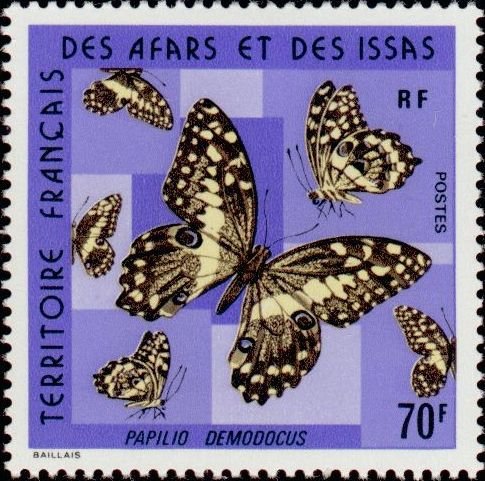 Visibility: public Image owner: none postage 70fr multi issue=butterflies 1975 dt=butterflies (1975 Afars & Issas) d=Papilio demodocus (1975) unwmk perf=13 Crops No visible images cropped from this one. Measurements Resolution is unknown. Source Source name: Colnect File URL: http://i.colnect.net/b/792/354/Citrus-Swallowtail-Papilio-demodocus.jpg Uploaded August 25, 2014, 12:46 am by Stan Shebs |