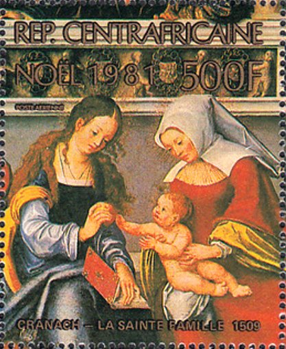 Visibility: public Image owner: none airmail 12/24/1981 500fr multi issue=Christmas 1981 unwmk Crops No visible images cropped from this one. Measurements Resolution is unknown. Source Source name: Colnect File URL: http://i.colnect.net/b/3516/346/-The-Holy-Family--by-Cranach-the-Elder.jpg Uploaded April 14, 2017, 1:18 am by Stan Shebs |