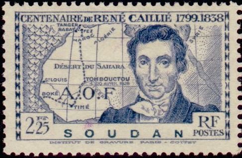 Visibility: public Image owner: none postage 4/15/1939 2.25fr issue=Caillie d=map of West Africa & Rene Caillie unwmk Crops No visible images cropped from this one. Measurements Resolution is unknown. Source Source name: Colnect File URL: http://i.colnect.net/b/802/994/Rene-Caillie-and-Map-of-Northwestern-Africa.jpg Uploaded August 25, 2014, 12:51 am by Stan Shebs |