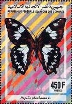 Visibility: public Image owner: none postage 5/24/1994 450fr multi issue=Insects 1994 dt=insects (1994 Comoro Islands) d=Papilio phorbanta unwmk perf=13.25 Crops No visible images cropped from this one. Measurements Resolution is unknown. Source Source name: Colnect File URL: http://i.colnect.net/b/3467/872/Papillon-La-Pature-Papilio-phorbanta.jpg Uploaded April 17, 2017, 12:16 am by Stan Shebs |