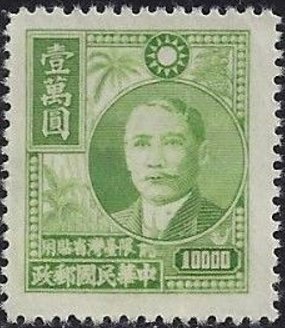 Visibility: public Image owner: none postage 1949 $10000 grn issue=1949a Crops No visible images cropped from this one. Measurements Resolution is unknown. Source Source name: Colnect File URL: http://i.colnect.net/b/3891/673/Dr-Sun-Yat-sen-1866-1925.jpg Uploaded April 17, 2017, 2:46 pm by Stan Shebs |