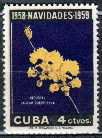 Visibility: public Image owner: none postage 12/16/1958 4c issue=Christmas 1958 dt=orchids (1958 Cuba) d=Oncidium gulbertianum wmk=star (Cuba) perf=12.5 Crops No visible images cropped from this one. Measurements Resolution is unknown. Source Source name: Colnect File URL: http://i.colnect.net/b/3096/591/Oncidium-guibertianum.jpg Uploaded April 20, 2017, 3:12 pm by Stan Shebs |