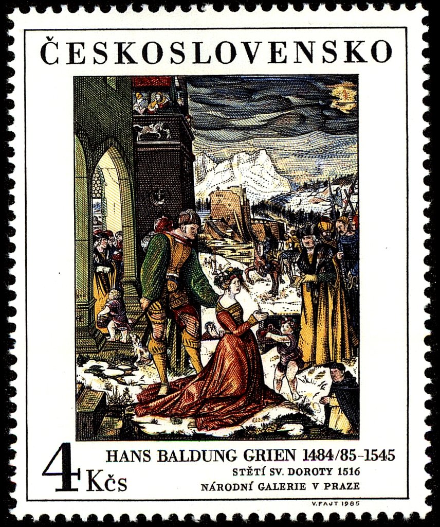 Visibility: public Image owner: none postage 11/27/1985 4kc multi dt=paintings from the National Gallery in Prague d=Beheading of St. Dorothea - Hans Baldung unwmk perf=11.75 Crops No visible images cropped from this one. Measurements Resolution is unknown. Source Source name: Colnect File URL: http://i.colnect.net/b/3800/390/The-Martyrom-of-St-Dorothea-1516-by-Hans-Baldung-Grien.jpg Uploaded April 21, 2017, 8:30 pm by Stan Shebs |