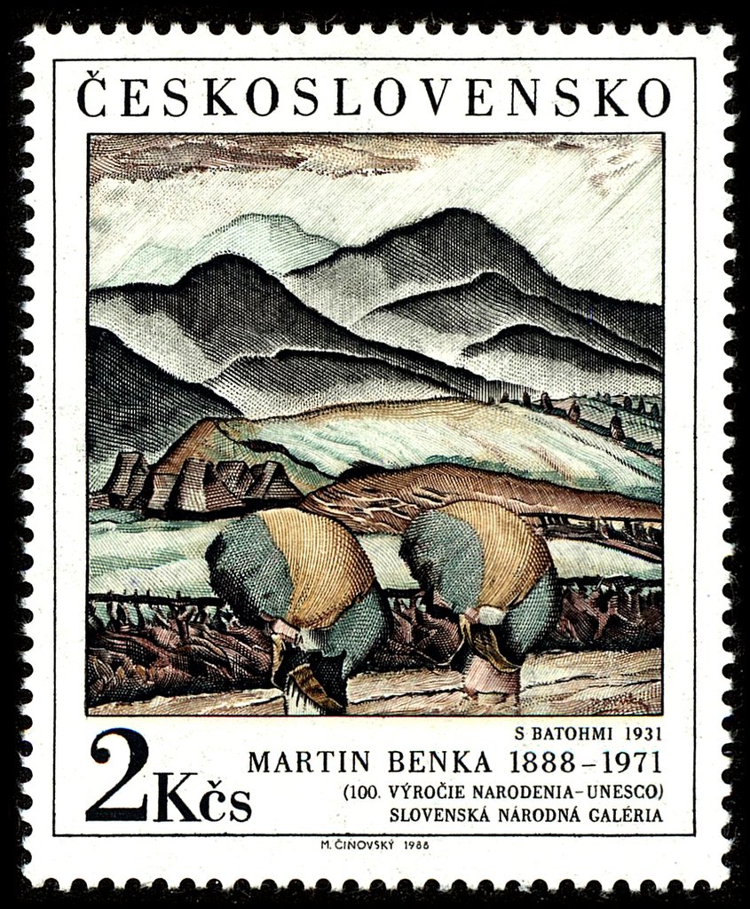 Visibility: public Image owner: none postage 11/17/1988 2kc multi dt=paintings from the National Gallery in Prague d=Field Workers carrying Sacks - By Martin unwmk perf=11.75 Crops No visible images cropped from this one. Measurements Resolution is unknown. Source Source name: Colnect File URL: http://i.colnect.net/b/3791/701/With-Bundles-by-Martin-Benka-1888-1971.jpg Uploaded April 21, 2017, 8:44 pm by Stan Shebs |
