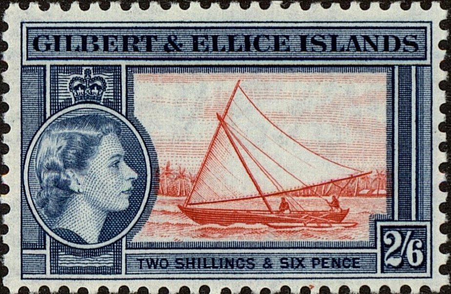 Visibility: public Image owner: none postage 8/1/1956 2sh6p bl&red issue=Elizabeth II pictorials d=Gilbert Islands canoe & Queen Elizabeth II wmk=mult crown & script CA Crops No visible images cropped from this one. Measurements Resolution is unknown. Source Source name: Colnect File URL: http://i.colnect.net/b/3915/166/Gilbert-Islands-Canoe.jpg Uploaded April 27, 2017, 8:32 pm by Stan Shebs |