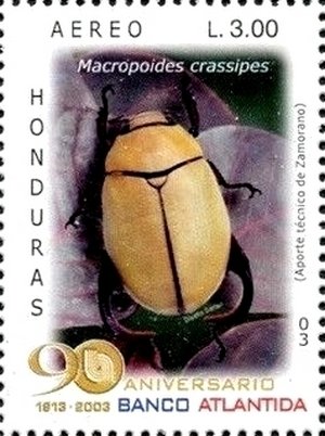 Visibility: public Image owner: none airmail 2/20/2003 3l multi issue=90th Anniversary of Banco Atlantida dt=insects (2003) d=Macropoides crassipes unwmk Crops No visible images cropped from this one. Measurements Resolution is unknown. Source Source name: Colnect File URL: http://i.colnect.net/b/3742/034/Scarab-Beetle-Macropoides-crassipes.jpg Uploaded May 1, 2017, 9:06 pm by Stan Shebs |