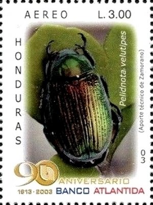 Visibility: public Image owner: none airmail 2/20/2003 3l multi issue=90th Anniversary of Banco Atlantida dt=insects (2003) d=Pelidnota velutipes unwmk Crops No visible images cropped from this one. Measurements Resolution is unknown. Source Source name: Colnect File URL: http://i.colnect.net/b/3742/035/Scarab-Beetle-Pelidnota-velutipes.jpg Uploaded May 1, 2017, 9:06 pm by Stan Shebs |