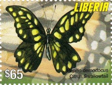 Visibility: public Image owner: none postage 8/5/2011 $65 multi issue=Butterflies of West Africa d=Papilio demodocus (2011 Liberia) unwmk perf=14 Crops No visible images cropped from this one. Measurements Resolution is unknown. Source Source name: Colnect File URL: http://i.colnect.net/b/3468/424/Citrus-Swallowtail-Paplilo-demodocus.jpg Uploaded May 11, 2017, 1:05 am by Stan Shebs |