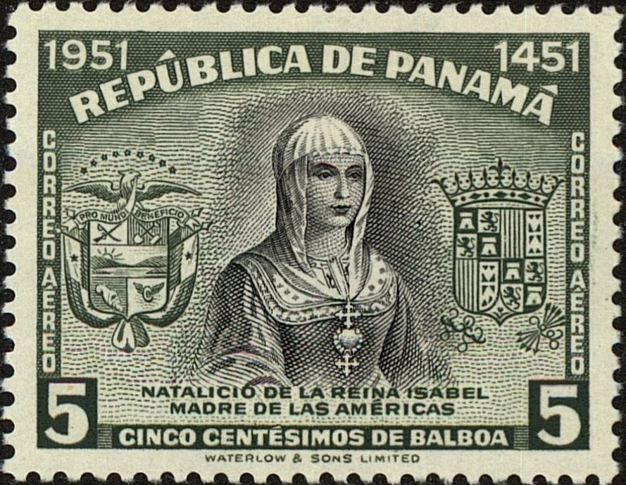 Visibility: public Image owner: none airmail 10/20/1952 5c ol&blk issue=Queen Isabella 500th unwmk Crops No visible images cropped from this one. Measurements Resolution is unknown. Source Source name: Colnect File URL: http://i.colnect.net/b/3506/006/Queen-Isabella-I-of-Spain.jpg Uploaded May 27, 2017, 1:58 am by Stan Shebs |