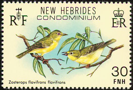 Visibility: public Image owner: none postage 2/27/1980 30fr dt=birds (1980 New Hebrides (Br)) wmk=mult crown & script CA Crops No visible images cropped from this one. Measurements Resolution is unknown. Source Source name: Colnect File URL: http://i.colnect.net/b/3805/710/Zosterops-flavifrons-flavifrons.jpg Uploaded May 29, 2017, 4:17 am by Stan Shebs |