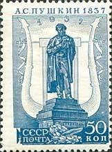 Visibility: public Image owner: none postage 2/1/1937 50k blue issue=1937 Pushkin dt=statue d=statue of Pushkin unwmk perf=12 paper=chalky & ordinary Crops No visible images cropped from this one. Measurements Resolution is unknown. Source Source name: Colnect File URL: http://i.colnect.net/b/963/824/Monument-of-A-S-Pushkin-in-Moscow.jpg Uploaded August 25, 2014, 4:08 pm by Stan Shebs |