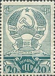 Visibility: public Image owner: none postage 5/1938 20k blgrn issue=arms of republics d=arms of Kazakh SSR unwmk perf=12 Crops No visible images cropped from this one. Measurements Resolution is unknown. Source Source name: Colnect File URL: http://i.colnect.net/b/711/481/Arms-of-Kazakhstan-republic.jpg Uploaded August 25, 2014, 4:09 pm by Stan Shebs |