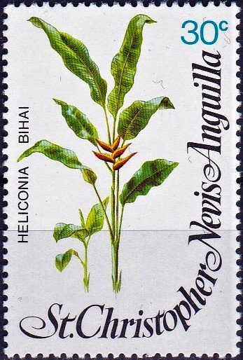 Visibility: public Image owner: none postage 3/19/1979 30c multi dt=flowers (1979 St. KittsNevis) d=Heliconia bihai wmk=crown & CA spiral perf=14 Crops No visible images cropped from this one. Measurements Resolution is unknown. Source Source name: Colnect File URL: http://i.colnect.net/b/3986/010/Heliconia-bihai.jpg Uploaded June 4, 2017, 10:45 pm by Stan Shebs |