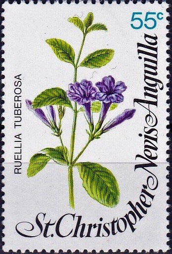 Visibility: public Image owner: none postage 3/19/1979 55c multi dt=flowers (1979 St. KittsNevis) d=Ruellia tuberosa (1979) wmk=crown & CA spiral perf=14 Crops No visible images cropped from this one. Measurements Resolution is unknown. Source Source name: Colnect File URL: http://i.colnect.net/b/3986/011/Ruellia-tuberosa.jpg Uploaded June 4, 2017, 10:45 pm by Stan Shebs |