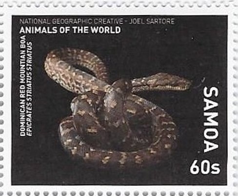 Visibility: public Image owner: none postage 9/7/2016 60s multi issue=Animals of the World d=Dominican Red Mountain Boa unwmk Crops No visible images cropped from this one. Measurements Resolution is unknown. Source Source name: Colnect File URL: http://i.colnect.net/b/3607/770/Dominican-Red-Mountain-Boa.jpg Uploaded June 5, 2017, 3:35 pm by Stan Shebs |
