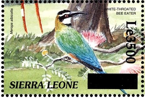 Visibility: public Image owner: none postage 3/10/2008 3500le multi issue=2008 surcharges h dt=birds of Africa (2000 Sierra Leone) d=Merops albicollis (2000) oc=blk on=600le-Merops albicollis unwmk perf=14.25 Crops No visible images cropped from this one. Measurements Resolution is unknown. Source Source name: Colnect File URL: http://i.colnect.net/b/3561/488/White-throated-Bee-eater-nbsp--nbsp--nbsp--nbsp-Merops-albicollis.jpg Uploaded June 7, 2017, 3:13 pm by Stan Shebs |
