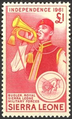 Visibility: public Image owner: none postage 4/27/1961 1lb car&yel issue=independence d=bugler, Royal Sierra Leone Military Forces wmk=St Edwards crown & SL perf=13.5 Crops No visible images cropped from this one. Measurements Resolution is unknown. Source Source name: Colnect File URL: http://i.colnect.net/b/3687/601/Bugler-Royal-Sierra-Leone-Military-Forces.jpg Uploaded June 7, 2017, 3:48 pm by Stan Shebs |