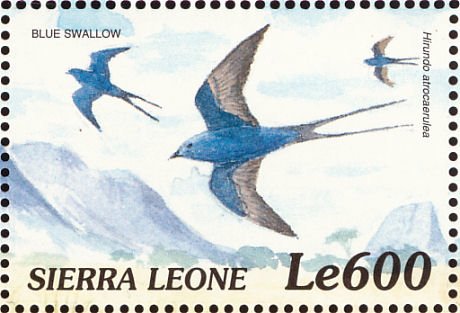 Visibility: public Image owner: none postage 1/4/2000 600le multi dt=birds of Africa (2000 Sierra Leone) d=blue swallow Hirundo atrocaerulea (2000) unwmk perf=14.25 Crops No visible images cropped from this one. Measurements Resolution is unknown. Source Source name: Colnect File URL: http://i.colnect.net/b/3807/361/Blue-Swallow-Hirundo-atrocaerulea.jpg Uploaded June 7, 2017, 4:29 pm by Stan Shebs |