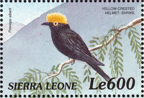 Visibility: public Image owner: none postage 1/4/2000 600le multi dt=birds of Africa (2000 Sierra Leone) d=Prionops alberti unwmk perf=14.25 Crops No visible images cropped from this one. Measurements Resolution is unknown. Source Source name: Colnect File URL: http://i.colnect.net/b/3807/379/Yellow-crested-Helmetshrike-Prionops-alberti.jpg Uploaded June 7, 2017, 4:29 pm by Stan Shebs |