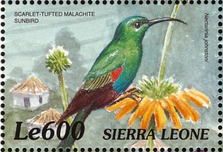Visibility: public Image owner: none postage 1/4/2000 600le multi dt=birds of Africa (2000 Sierra Leone) d=Nectarinia johnstoni (2000) unwmk perf=14.25 Crops No visible images cropped from this one. Measurements Resolution is unknown. Source Source name: Colnect File URL: http://i.colnect.net/b/3807/380/Scarlet-tufted-Sunbird-Nectarinia-johnstoni.jpg Uploaded June 7, 2017, 4:29 pm by Stan Shebs |