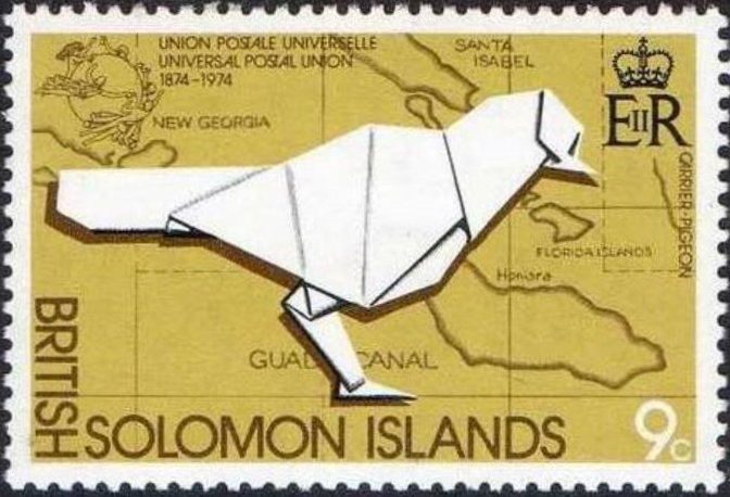 Visibility: public Image owner: none postage 8/29/1974 9c multi issue=100th Anniversary of U.P.U. d=origami pigeon wmk=mult crown & script CA perf=14 Crops No visible images cropped from this one. Measurements Resolution is unknown. Source Source name: Colnect File URL: http://i.colnect.net/b/3961/062/Carrier-pigeon.jpg Uploaded June 7, 2017, 8:45 pm by Stan Shebs |