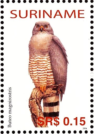 Visibility: public Image owner: none postage 10/21/2004 $0.15 multi issue=birds 2004 dt=birds (2004 Surinam) d=Buteo magnirostris unwmk Crops No visible images cropped from this one. Measurements Resolution is unknown. Source Source name: Colnect File URL: http://i.colnect.net/b/3837/054/Roadside-Hawk Rupornis-magnirostris.jpg Uploaded June 10, 2017, 4:01 am by Stan Shebs |