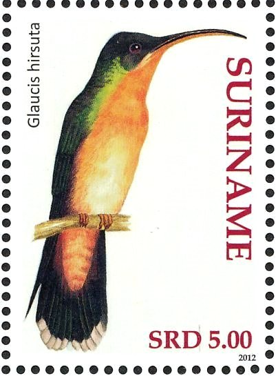 Visibility: public Image owner: none postage 5/23/2012 $5.00 multi issue=Birds 2012 dt=birds (2012 Surinam) d=Glaucis hirsuta (2012) unwmk perf=14 Crops No visible images cropped from this one. Measurements Resolution is unknown. Source Source name: Colnect File URL: http://i.colnect.net/b/3837/163/Rufous-breasted-Hermit Glaucis-hirsutus.jpg Uploaded June 10, 2017, 4:29 am by Stan Shebs |