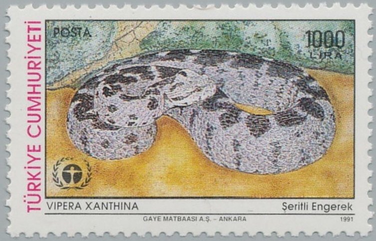 Visibility: public Image owner: none postage 10/23/1991 1000l multi issue=World Environment Day 1991 dt=snakes (1991 Turkey) d=Vipera xanthina unwmk Crops No visible images cropped from this one. Measurements Resolution is unknown. Source Source name: Colnect File URL: http://i.colnect.net/b/2673/876/Rock-Viper-Vipera-xanthina.jpg Uploaded June 15, 2017, 3:15 pm by Stan Shebs |
