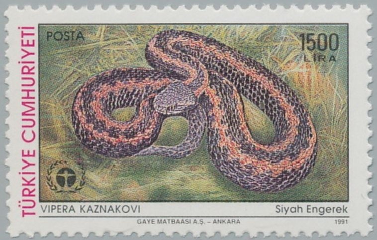 Visibility: public Image owner: none postage 10/23/1991 1500l multi issue=World Environment Day 1991 dt=snakes (1991 Turkey) d=Vipera kaznakovi unwmk Crops No visible images cropped from this one. Measurements Resolution is unknown. Source Source name: Colnect File URL: http://i.colnect.net/b/2673/879/Caucasus-Viper-Vipera-kaznakovi.jpg Uploaded June 15, 2017, 3:15 pm by Stan Shebs |