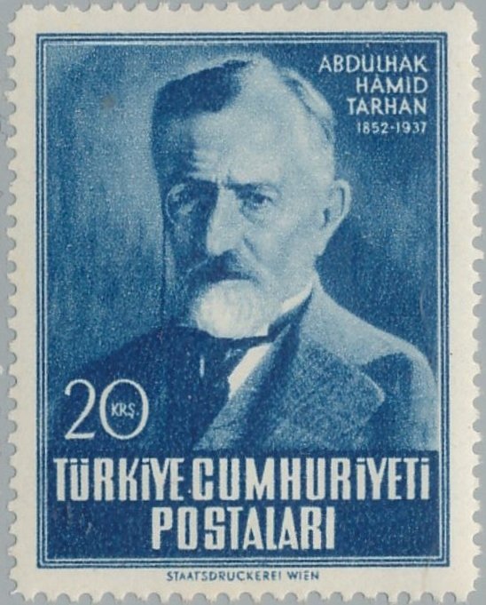 Visibility: public Image owner: none postage 2/5/1952 20k dkbl issue=Tarhan 100th d=Abdülhak Hâmid Tarhan unwmk perf=13.5 Crops No visible images cropped from this one. Measurements Resolution is unknown. Source Source name: Colnect File URL: http://i.colnect.net/b/2563/657/Abdulhak-Hamit-Tarhan-Poet-1852-1937.jpg Uploaded June 15, 2017, 4:16 pm by Stan Shebs |
