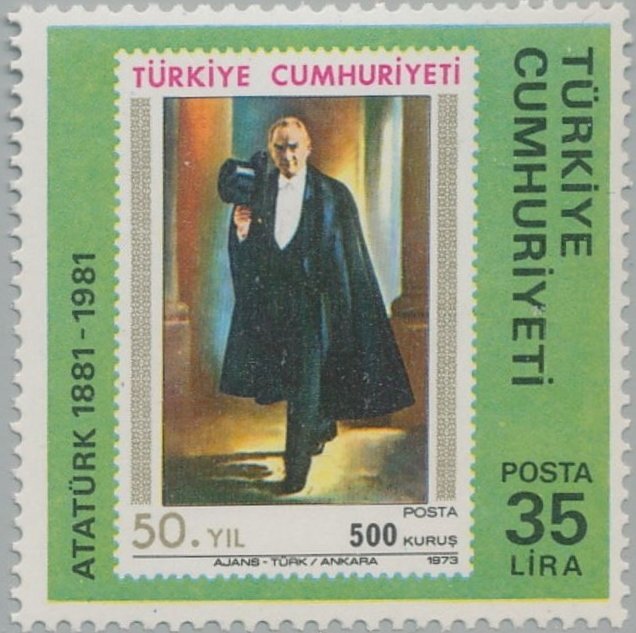 Visibility: public Image owner: none postage 5/19/1981 35l multi issue=100th Anniversary of the Birth of Kemal Ataturk d=Ataturk in Evening Dress unwmk perf=14.25x14.75 Crops No visible images cropped from this one. Measurements Resolution is unknown. Source Source name: Colnect File URL: http://i.colnect.net/b/2588/562/Kemal-Ataturk-President-TR2304.jpg Uploaded June 15, 2017, 4:54 pm by Stan Shebs |